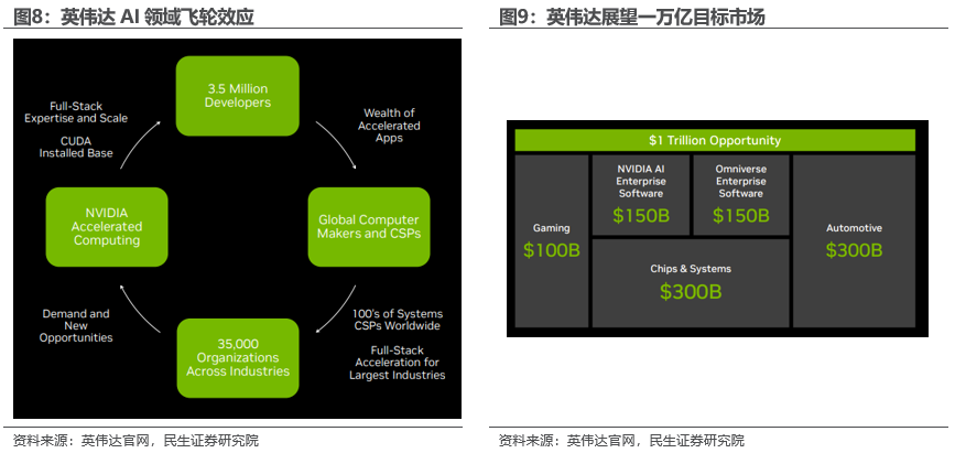 英伟达在AI领域创造飞轮效应,目标市场超万亿美元。英伟达AI领域飞轮效应体现在以下几个方面: