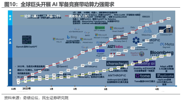 海外巨头展开AI军备竞赛,算力强需求状态将维持甚至进一步提升。根据奇绩论坛,以2022年底ChatGPT出圈为起点,微软、谷歌、Meta以及众多AI独角兽迅速展开AI军备竞赛,AI算力严重供不应求,GPT停止账户申请和英伟达大涨都验证了算力的强需求。我们认为,当前已经十分强劲算力需求有望伴随高纬度多模态数据的训练以及海量的边缘AI推理的部署进而指数级提升。