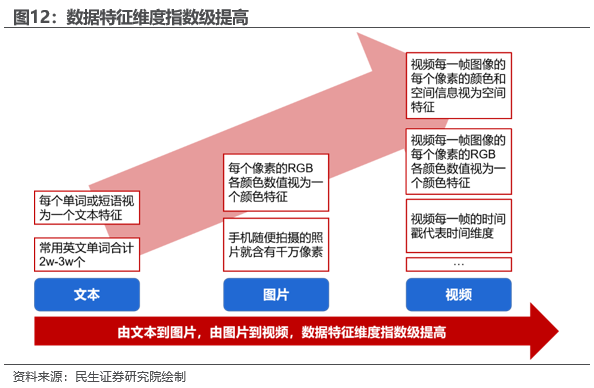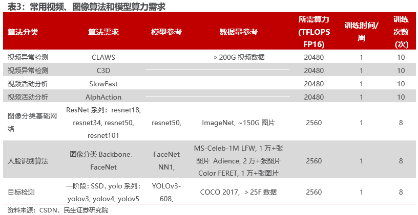 在大模型训练中,影响算力需求的主要因素有数据的信息密度和处理复杂度,算力需求随特征维度提升指数级提高。据CSDN,视频异常检测、视频活动分析等视频模型需要的算力是人脸识别、目标检测等图像模型算力需求的十倍。