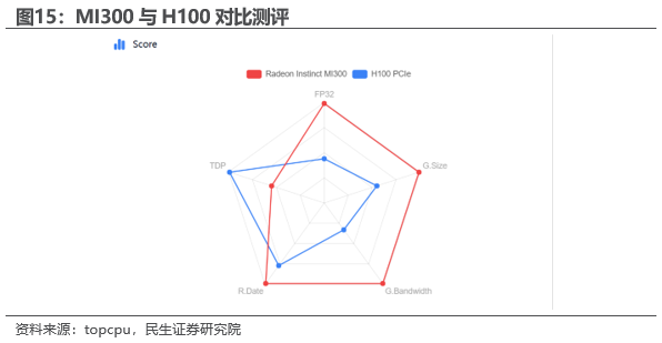 据TOPCPU测评,AMD最新MI300算力芯片纯硬件性能未必弱于英伟达H100,但英伟达以Tensor RT+CUDA的软件生态仍然是难以逾越的护城河。2023年CES 2023展会上AMD发布的MI300拥有13个小芯片,基于3D堆叠,包括24个Zen4 CPU内核,同时融合了CDNA 3和8个HBM3显存堆栈,集成了5nm和6nm IP,总共包含128GB HBM3显存和1460亿晶体管,据topcpu测评数据,纯硬件上MI300与H100互有胜负,差距不明显。相比之下,英伟达在软件生态层面建立Tensor RT+CUDA护城河优势更为显著。AMD自研ROCm框架采用开源模式有望弯道超车:ROCm使得开发人员能够获得 AMD Infinity Hub 交钥匙人工智能框架容器、改进的工具、精简安装,并支持TensorFlow 和 PyTorch 等主要机器学习框架,以帮助用户加速人工智能工作负载。从优化的 MIOpen 库到全面的 MIVisionX 计算机视觉和机器智能库、实用程序和应用程序,AMD 与人工智能开放社区广泛合作,以促进和扩展机器和深度学习功能和优化,从而帮助扩大加速计算所适用的工作负载。