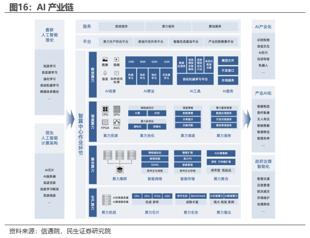 AI产业链分为上游算力基础设施、中游大模型和算法以及下游各类AI应用。AI的上游算力需求超预期有望带动整个AI产业链走向兑现的新阶段。