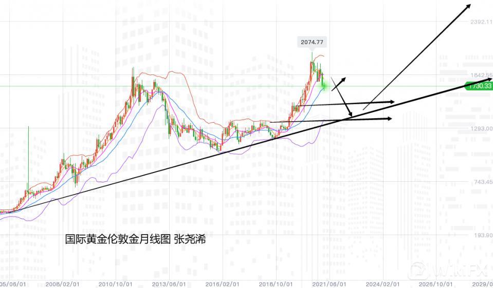 悲观情况,那则看2075就是较中长期的顶,未来或许1-2年过不去。悲观先放弃,因为,年线显示,还没有破位5年均线,牛市的标志还没有破坏。如果跌破了1550(30月均线),那就悲观了!但也是长期的入场机会,跌破将下行至1370-1450区域是非常不错的机会。后市将去向2500美元乃至3000美元。