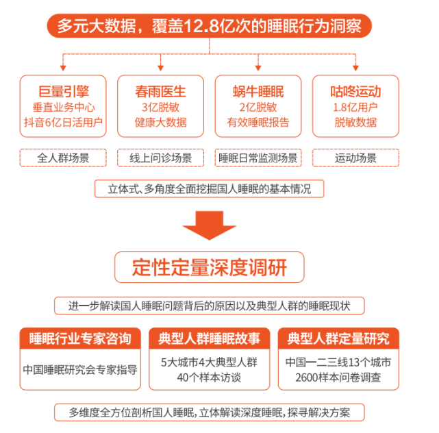 喜临门报告由中国睡眠科学领域唯一的国家一级社会团体——中国睡眠研究会提供技术支持,巨量引擎、咕咚运动、春雨医生、蜗牛睡眠等领先的互联网平台为协同支撑,结合国内外睡眠科学领域的最新研究成果,由中国趋势营销服务创新机构知萌咨询作为调研机构,中国医疗健康专业知识智享平台《健康界》作为战略支持媒体,深入分析了12.8亿次国人睡眠行为,形成后疫情时代覆盖人群最广泛的中国人睡眠画像。
