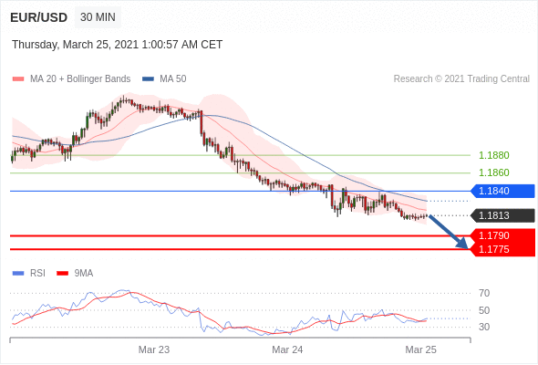在 1.1840 之下,看跌,目标价位为 1.1790 ,然后为 1.1775 。