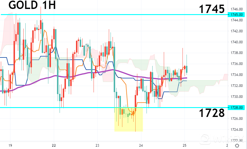 观察黄金小时图,云图快线与慢线黄金交叉,处于云层及EMA120(紫线)之上,先前空方发力一度跌破下方支撑(黄框处),虽之后短线反弹较无力,但未再破低(约1724),短线技术性反弹向上,建议先以1728-1745区间震荡观察,激进者可按区间低多高空操作,否则静待多空表态再行入场。