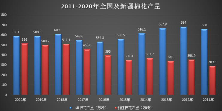 从国内情况来看,从1949年全国产量44.4万吨起步,中国棉花产量在2007年攀上了759.71万吨的最高峰,随后有所回落,但仍位于世界前列。2020年的数据显示,我国的棉花总产量达591万吨,其中新疆地区的棉花总产量达到516万吨。