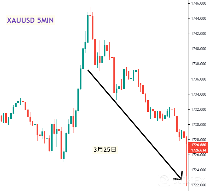 美联储官员明显由鸽转鹰,带动美元及美债收益率上涨,金价因此承压,终场下跌约7.6美元或跌幅约0.4%,收在约1727美元,如下图。
