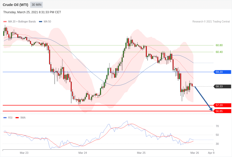 交易策略:在59.20 之下,看跌,目标价位为 57.20 ,然后为56.85 。