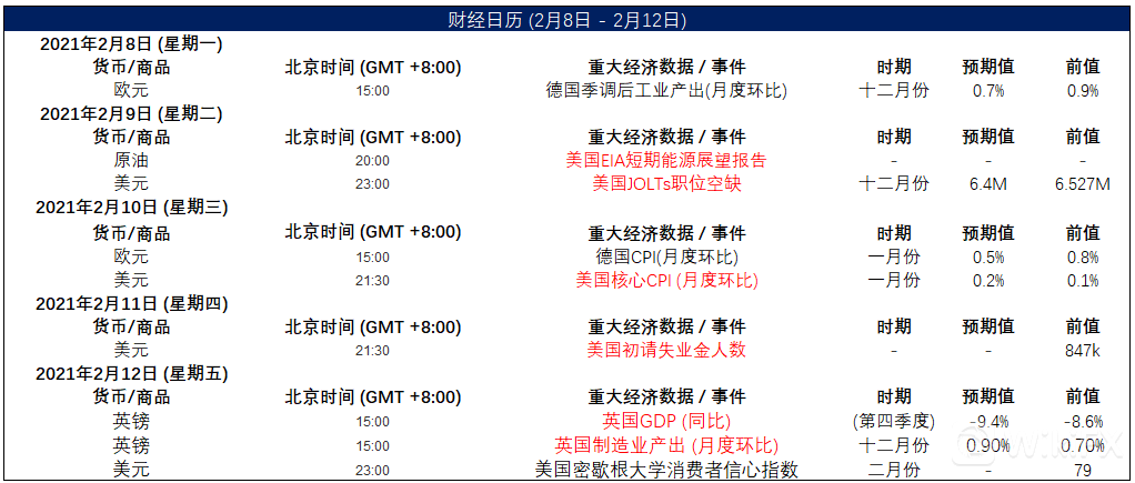 避险货币方面,日内,美元指数小幅下跌,主要是因遭遇多头获利盘打压,以及有消息称英国与欧盟将在疫苗供给问题上达成谅解协议,从而暂时化解当前面临的危机,这也令欧系货币触底回升,从而也打压了美元。不过就目前来看,中期美国经济的表现,可能会超过欧元区,美债收益率也还有上升空间。因此,预计短线美元调整以后仍有上升动能,中线偏强。