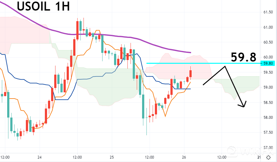 观察美油小时图,云图快线与慢线黄金交叉,进入到云层之中,于EMA120(紫线)之下,短线反弹向上,出现上冲下洗的震荡走势,建议若反弹至59.8短压位置,尝试空单进场。