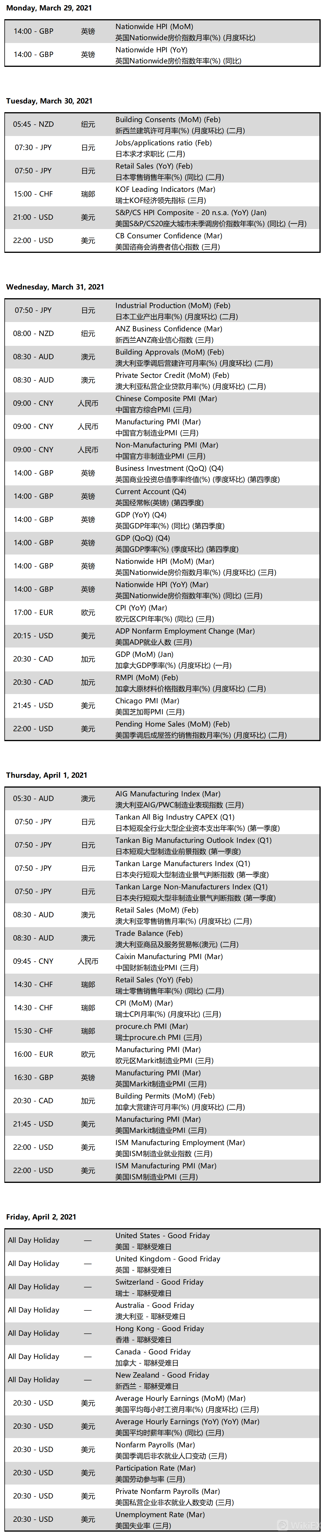 以下为下周2021/03/29 – 2021/04/02(GMT+8北京时间)重要经济事件以及相关货币提醒,由于行情结果不稳定,届时市场可能会面临大波动,导致市场缺口。Doo Prime 德璞资本提醒您,在管理风险时,请同时考虑其他任何重大行情新闻公告。