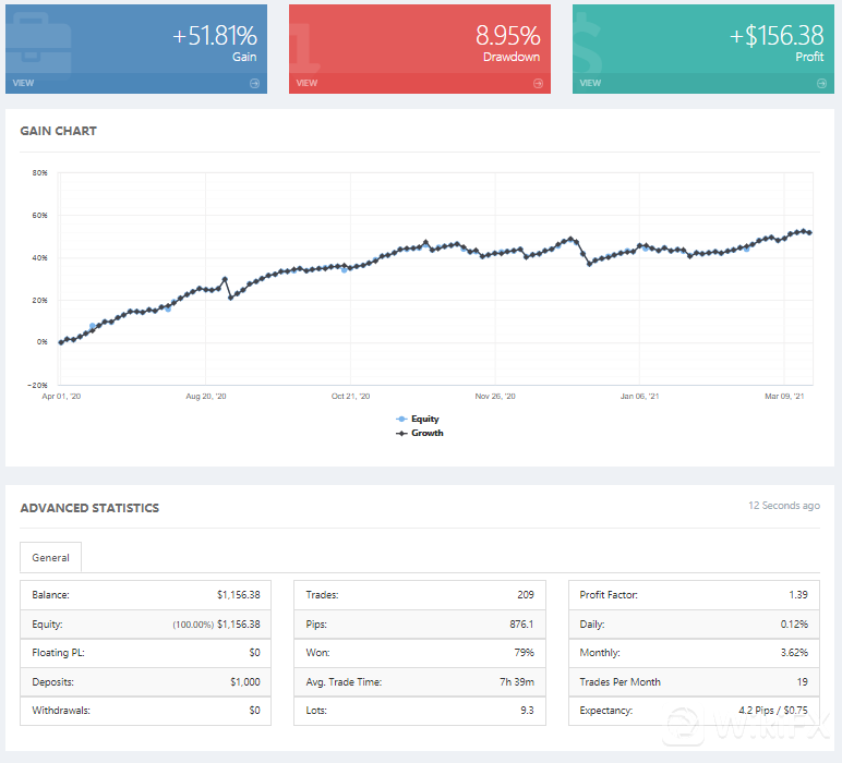 NIGHT_EAGLE从2020年4月进入Myfxbook AutoTrade跟单社区,总收益率达到51.81%,最大历史回撤率为8.95%,总利润为156.38美元,盈利因子为1.39,总交易笔数达209笔,总手数为9.3,平均交易时长为7小时39分钟。