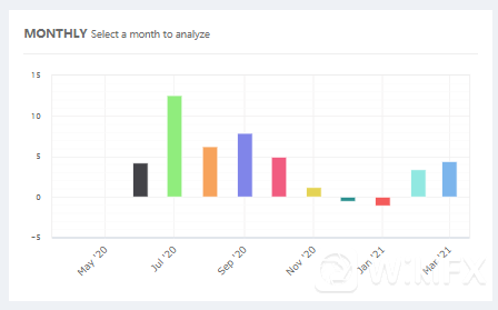 该信号源在他10个月的交易记录中,盈利的月数有8个,平均月收益率3.62%。