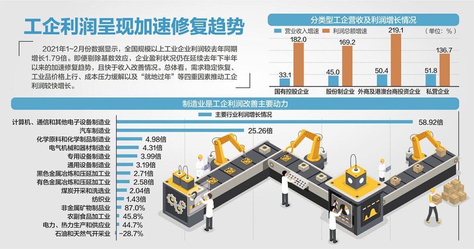 而分行业来看,最值得关注的还是制造业特别是中游制造业企业盈利能力的修复,1~2月制造业实现利润总额同比增长2.20倍。装备和高技术制造业带动作用明显。1~2月份,装备制造业和高技术制造业利润同比分别增长7.07倍和3.08倍;从两年平均看,分别增长55.3%、60.2%。其中,医药制造业受益于疫苗需求迅速增加、防疫抗疫产品增长较快等因素共同作用,利润同比增长95.4%。原材料制造业利润增势良好。1~2月份,原材料制造业利润同比增长3.46倍,两年平均增长46.4%。受产品价格上涨、成本为低价库存原材料等因素推动,相关行业企业利润率明显上升。