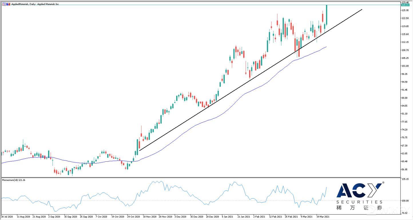相比于阿斯曼,应用材料的产业链更加广泛,这也让其存在更大的增产潜能。从Applied Material应用材料日线图来看,股价的上涨局势更加的稳定。仅在3月8日有小幅下破现象,但随后很快就回到趋势线上方。动量指标近期多数时间处在零线上方,目前还未出现高位拐点。50日均线保持向上,K线维持在均线上方,整体来看是强多头局势。与阿斯曼相同,交易策略也是以逢低做多为主。应用材料的趋势线支撑力量更强,现价下方的支撑点位在前高点的共同结构120-125区间。由于科技板块波动性较大,再下方的支撑位置在50日均线,110位置可以作为止损的参考。