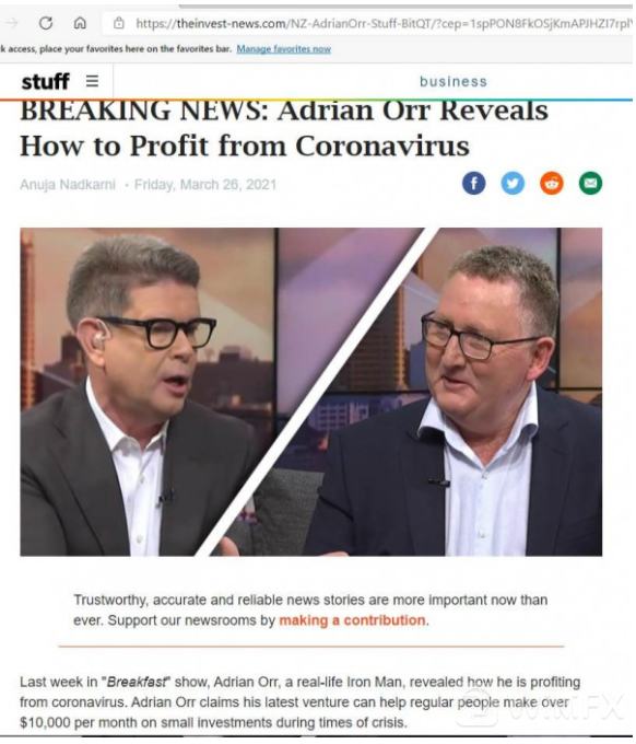 当局注意到,Facebook存在一误导性广告,该广告链接到一篇有关盗用Stuff品牌商标的文章。这篇文章通过声称知名的新西兰人和海外公众人士对其进行投资来推广BitQT。但实际上,这篇文章并不是出自实体Stuff,而文章中的的声明也不正确。