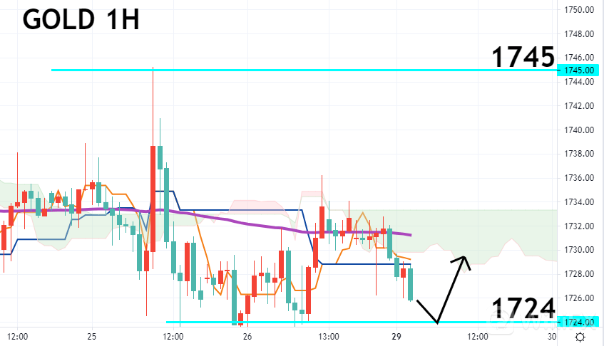 观察黄金小时图,云图快线与慢线死亡交叉,处于云层及EMA120(紫线)之下,金价走势震荡较无明确方向,虽短线空方动能较强,但屡攻未破1724一带,此处为强支撑,日内建议若回调至约1724强撑位置,分批进场多单布局。