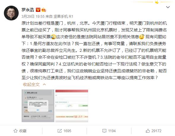 根据罗永浩微博,其原计划出差行程是厦门、杭州、北京。厦门行程结束后,厦门到杭州的机票已经买了,买杭州回北京机票时,发现又被上了限制消费名单,导致不能买票。他还表示,这次奇怪的是查法院网站居然查不到相关信息。