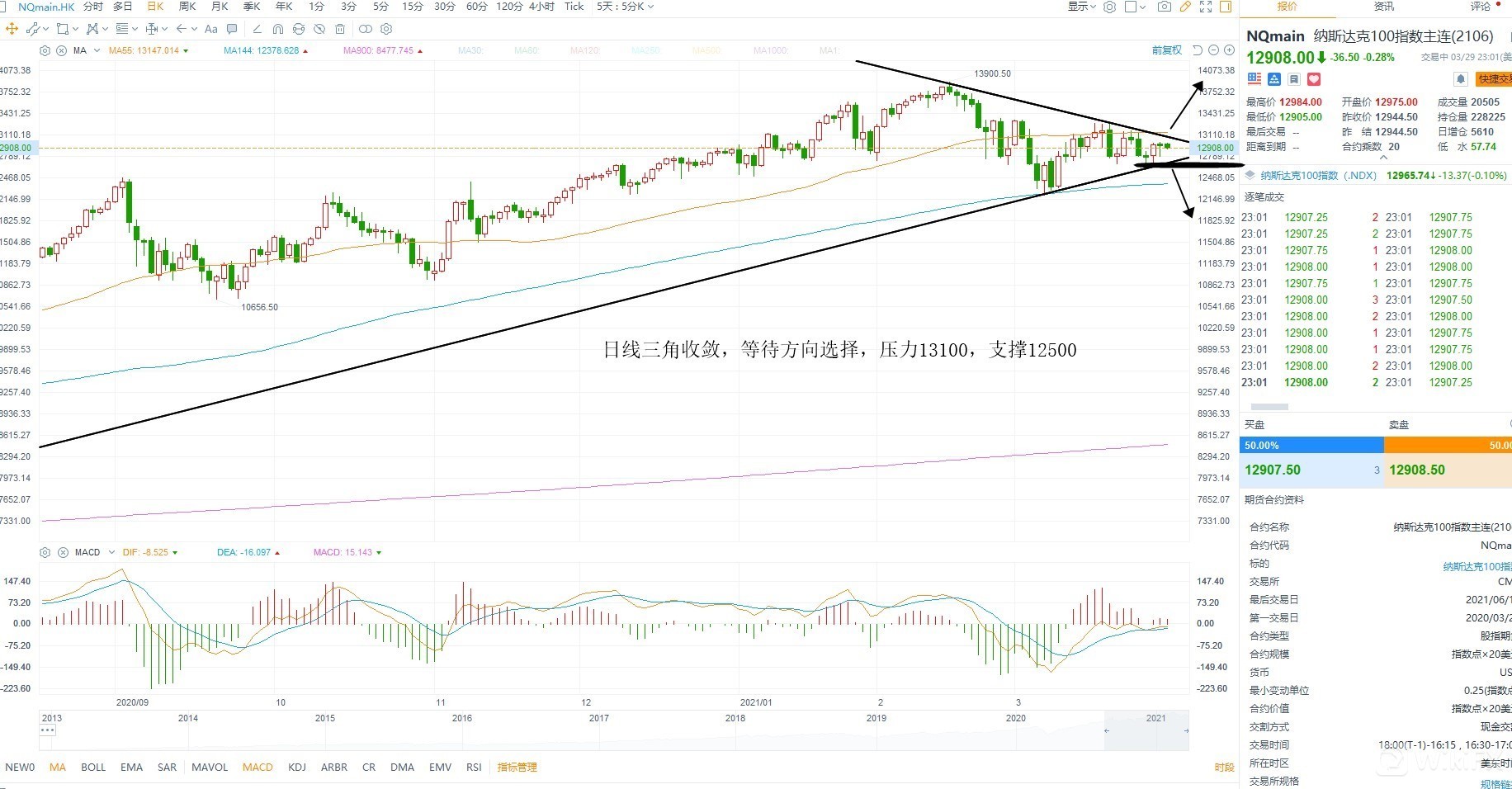 纳斯达克指数继续维持震荡走势,短线而言美债的上涨对其影响不大,而估值得杀还在继续,因此等待反弹之后的二次杀跌为主,技术层面处于三角收敛,上方重要压力13100不破则有回落风险,突破则测试前期高点13600上方,下方重要支撑12500不能破位,如果破位则二次杀跌开始