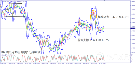 日级别线图,长阴烛受阻5日均线,若突破该均线,可能出现反弹;15分钟K线,短线出现下降三角形整理,若守住整理底部,可能挑战起跌阻力。