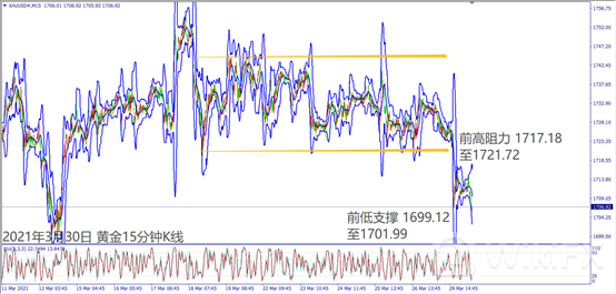 日级别线图,出现圆形顶反转,若冲不过5日均线,可能延续跌势;15分钟K线,跌破盘整形态回落至1710美元附近整理,若冲不过前高阻力,可能回测前低支撑。