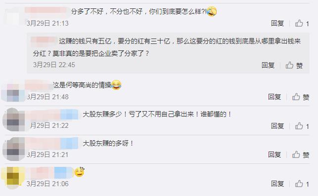 “土豪”般的分红计划让网友直呼“想不通”。有网友提到“这是何等高尚的情操”还有网友指出,“明显有问题”“大股东赚的多呀!”也有网友反驳称,“分多了不好,不分也不好,你们到底要怎么样?”
