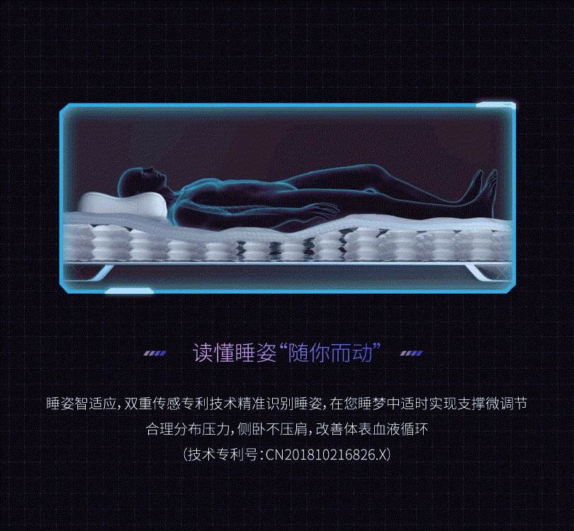 这才是真正的智能,就像在床垫中藏着一个会思考的大脑,可以和每一个独特的你的身体对话,智能调节,精准匹配,不断进化,只为你能有一个优质的睡眠。