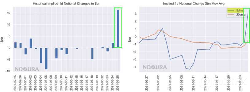 上周二,零对冲预测3月末美股市场将发生资金流冲突,一方面是巨大的抛售压力,摩根大通预计共同基金抛售额可能高达3160亿美元;另一方面是以波动率为导向的机构和一些量化基金可能会加大购买量,因为3月份的恐怖指数(VIX)已经飙升至过去12个月以来的高值,这是出手的好时机。