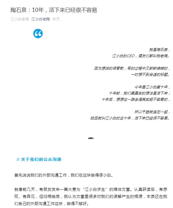 (吴晓薇)3月29日晚间,江小白创始人陶石泉在其个人微信公众号“江小白老陶”上发布名为“10年,活下来已经不容易”的文章,否认了“裁撤整个北京公关团队”的说法。