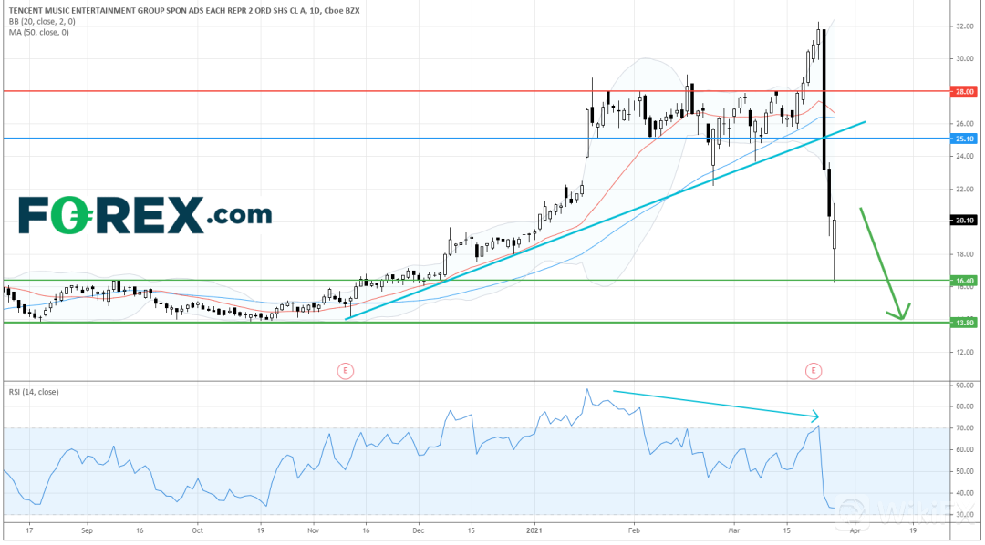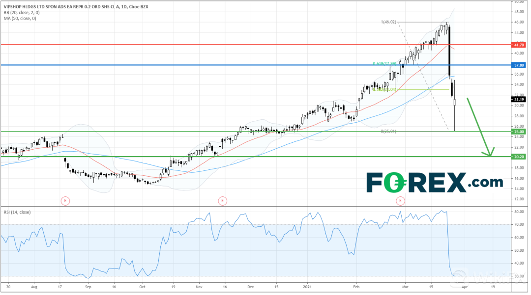 在日线图上,股价跌破了2020年11月以来的上升趋势线,表明了看跌逆转信号。相对强弱指数在出现看跌背离信号后下挫至30多点。