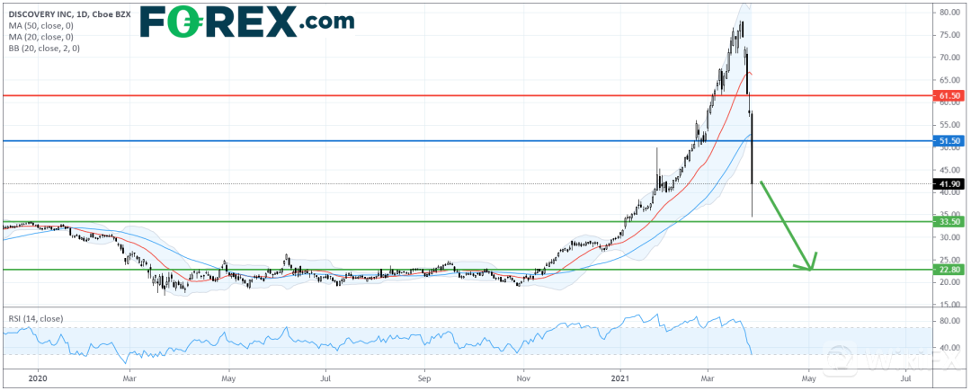 在日线图上,Discovery (DISCA.US) 股价走势基本上与ViacomCBS (VIAC) 相同,尽管走势承压,但需提防技术反弹。它一口气跌破了20日及50日移动均线,而且没有明确反转向上的技术信号。
