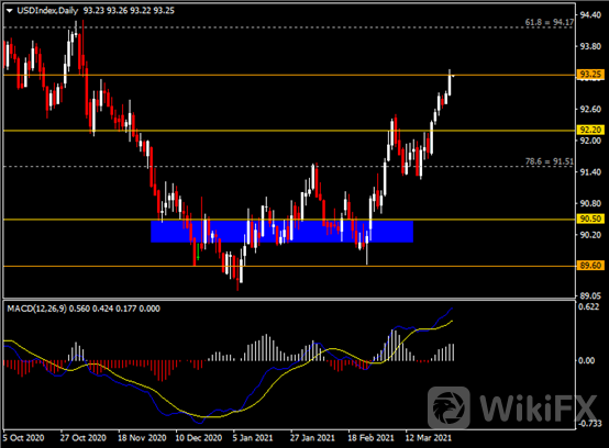 汇市方面,美元指数强势走高逾0.5%并上破93水平,为4个多月以来新高。