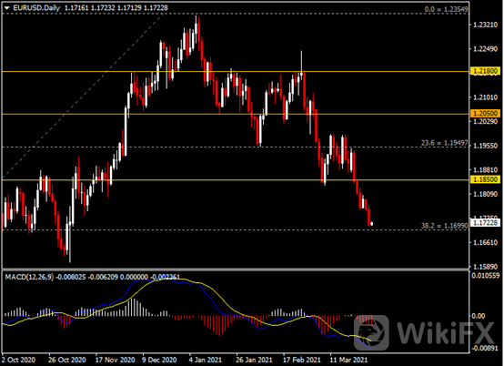 日线图显示欧元兑美元承压走弱,当前逼近1.1700支撑。从MACD来看,快慢线向下运行,红色动能柱温和增量。汇价走势基本和动能柱的变化一致。