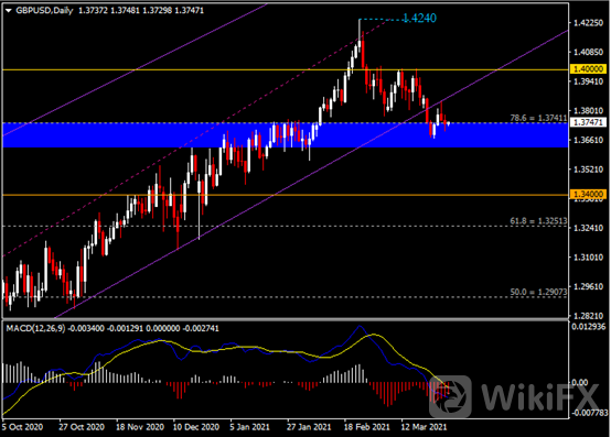 日线图显示英镑兑美元温和走低,当前测试1.3740支撑。从MACD来看,快慢线向下运行,红色动能柱则持续收敛。汇价走势和动能柱的变化呈分歧。