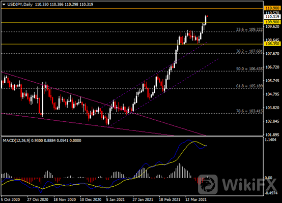 日线图显示美元兑日元录得5日连涨,当前收于前高109.90。从MACD来看,快慢线形成金叉,红色动能柱收缩殆尽。汇价走势基本和动能柱的变化一致。