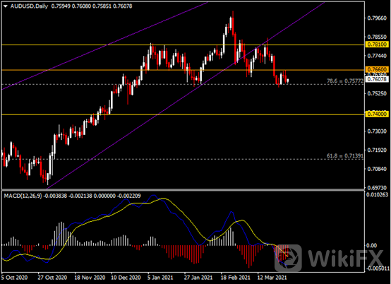 日线图显示澳元兑美元遇阻回落,当前承压于0.7660区间阻力。从MACD来看,快慢线向下运行,红色动能柱则温和收敛。汇价走势和动能柱的变化呈分歧。