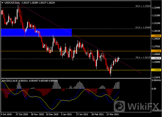 日线图显示美元兑加元温和上涨,当前略收于前高1.2610。从MACD来看,快慢线向上运行,白色动能柱略呈平行。汇价走势和动能柱的变化稍有分歧。
