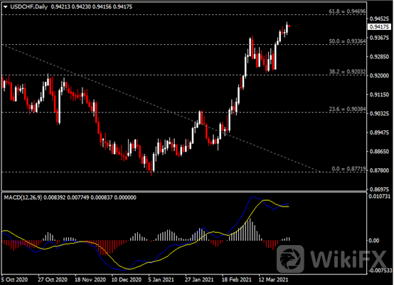 日线图显示美元兑瑞郎震荡上行,当前企稳于0.9335支撑。从MACD来看,快慢线金叉依旧,白色动能柱温和增量。汇价走势基本和动能柱的变化一致。