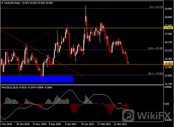 日线图显示银价空头动能加剧,当前测试23.80区间支撑。从MACD来看,快慢线向下扩张,红色动能柱持续放量。银价走势基本和动能柱的变化一致。