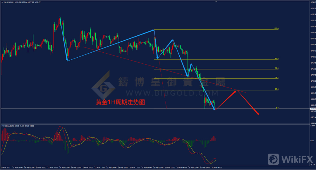 从下方的黄金1H周期图可以看出,昨日黄金延续前期跌势持续下破,黄金价格逐步挑战前期低点1676.0一线支撑。从形态上看,黄金在跌破前期整理区间后趋势逐渐明朗,日内下跌力量较强,当前属于空头走势。从MACD指标可以看出,DIFF以及DEA线在0轴下方超卖区域,双线靠拢形成弱势金叉向上,说明黄金短期有反弹的概率,建议反弹上方压力1693.0附近尝试布局空单。