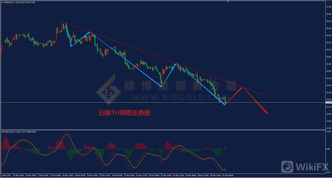 从下图白银1小时图来看,昨日白银价格再次破位前期低点,空头趋势依旧强势。从形态上看,目前白银属于阶梯式下跌,不断破位前低出现新低,目前下跌节奏运行良好,价格并未突破下降趋势线的压制,说明短期内白银依旧较大概率偏空。指标方面,MACD指标的DIFF和DEA双线在0轴偏下方超卖区域,双线形成弱势金叉往上,说明有较大概率会出现小幅反弹,建议反弹高点24.30附近尝试布局空单。
