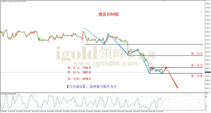 从上图黄金30M周期图来看,黄金在向下突破关键支撑1821后,走出了加速下跌。在跌至1667附近后受到支撑,目前窄幅震荡,从反弹幅度来看多头力度依旧薄弱,预计后市大概率将延续下跌。指标方面,当前KD指标依旧呈现死叉并开口向下的形态,预计此次下跌尚有空间。建议日内可等待黄金在反弹到上方关键压力位1687附近后,尝试布局空单进行操作。