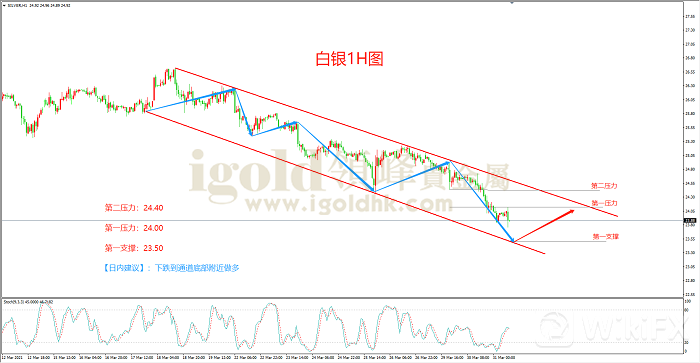 从上图白银1小时图来看,白银在此前从顶部向下破位后,一直沿着下行通道走出下跌趋势。当前行情已经运行到通道底部附近,预计行情将会在触碰底部支撑后进行反弹。且从指标上看,当前KD指标下方空间有限,后市大概率在进入超卖区间后金叉迎来反弹。日内建议等待行情到达下方低点附近后布局多单。