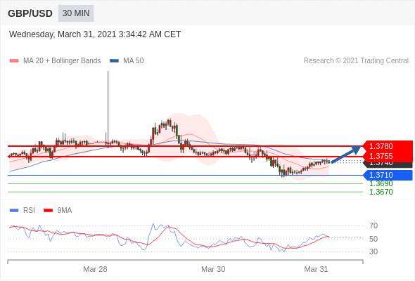 交易策略:在1.3710之上,看涨,目标价位为1.3755,然后为1.3780。
