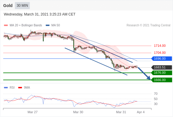 交易策略:在1696.00之下,看跌,目标价位为1676.00,然后为1666.00。
