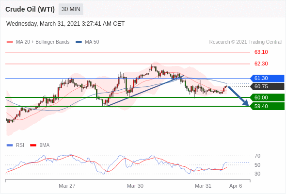交易策略:在61.30之下,看跌,目标价位为60.00,然后为59.40。