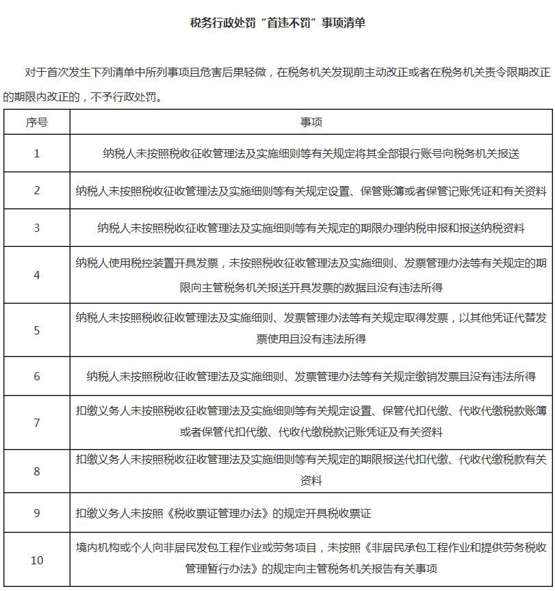 国税总局介绍,新修订的《中华人民共和国行政处罚法》第三十三条第一款规定,初次违法且危害后果轻微并及时改正的,可以不予行政处罚。《税务行政处罚裁量权行使规则》(国家税务总局公告2016年第78号发布)第十一条规定,法律、法规、规章规定可以给予行政处罚,当事人首次违反且情节轻微,并在税务机关发现前主动改正的或者在税务机关责令限期改正的期限内改正的,不予行政处罚。对当事人的违法行为依法不予行政处罚的,行政机关应当对当事人进行教育。