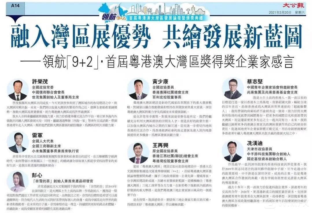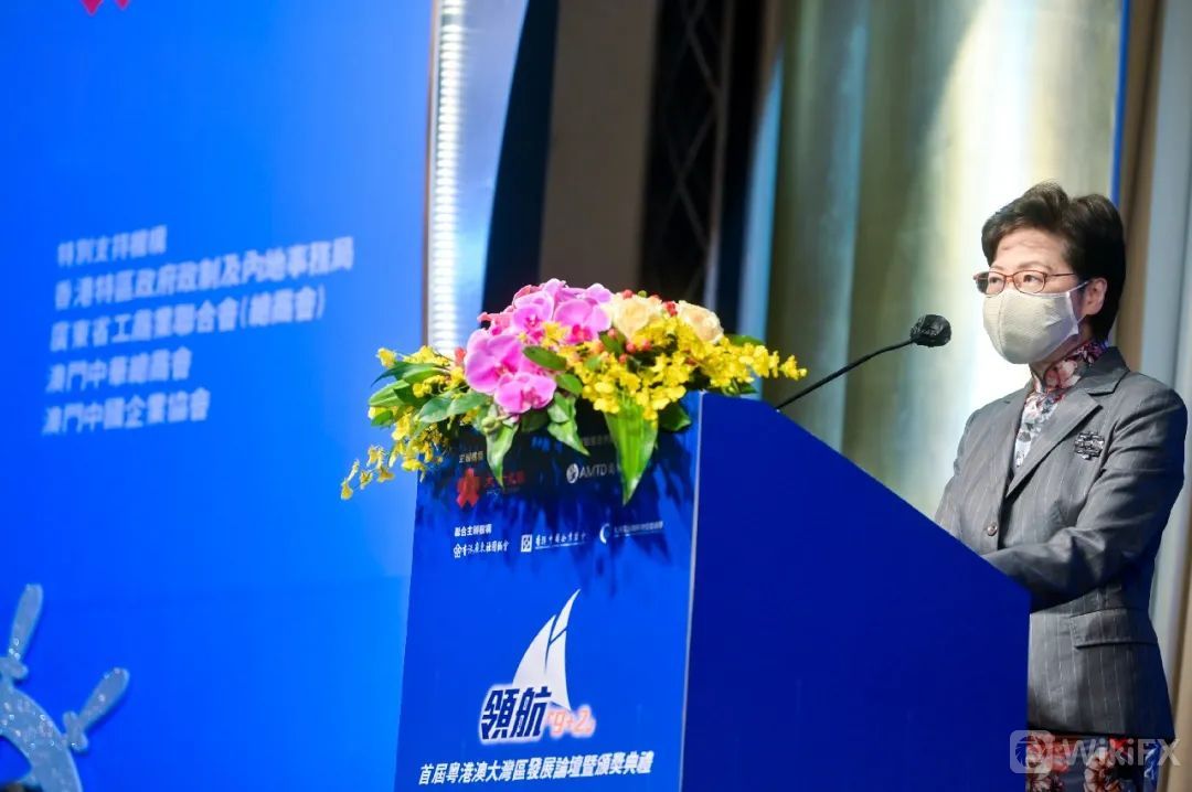 Organised by Hong Kong Ta Kung Wen Wei Media Group together with Hong Kong Chinese Enterprises Association, Federation of Hong Kong Guangdong Community and Greater Bay Area Fintech Promotion Association, the first “Pilot 9+2” Guangdong-Hong Kong-Macao Greater Bay Area Development Forum and Award Ceremony was successfully held recently in Hong Kong. “Pilot” refers to the Greater Bay Area taking the lead in the future development of our country. It also means that the enterprises and individuals who pioneer in the development of the Greater Bay Area are the pilot leaders in the regions economic era. More than 150 guests attended the event, including Mrs. Carrie Lam, Chief Executive of the Hong Kong Special Administrative Region, Ms. Qiu Hong, Deputy Director of the Liaison Office of the Central Government in Hong Kong, Mr. Li Jiangzhou, Deputy Director of the Office for Safeguarding National Security of the CPG in Hong Kong, Mr. Song Ru'an, Deputy Commissioner of the Office of the Commissioner of the Ministry of Foreign Affairs in Hong Kong, Mr. Erick Tsang, Secretary for Constitutional and Mainland Affairs of the HKSAR Government, and Mr. Li Dahong, Vice Chairman and Editor-in-Chief of the Hong Kong Ta Kung Wen Wei Media Group. Mrs. Carrie Lam, Ms. Qiu Hong, Mr. Li Dahong, and Mr. Gong Junlong (Chairman of the Federation of Hong Kong Guangdong Community Organisations), delivered speeches at the forum.