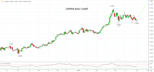 铜与澳元/美元呈正相关。从下图可以看出,铜价的修正即将结束一个收缩三角形,这种情况通常利好多头。