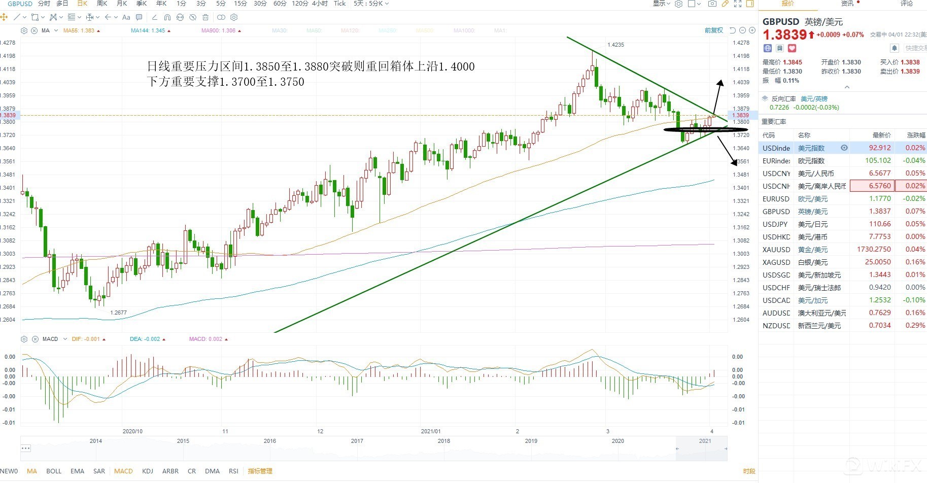 镑美日线图形处于收敛之中,但是昨日反弹之后站上均线支撑,而目前的结构是强于欧元的,且并没受美元的上涨影响形成大幅下跌,因此等收敛突破则大概率有结束调整的可能性,日内注意重要压力区间1.3850至1.3880突破则重新测试箱体压力1.4000,下方重要支撑1.3750至1.3700不能破位,若跌破则有可能深度调整